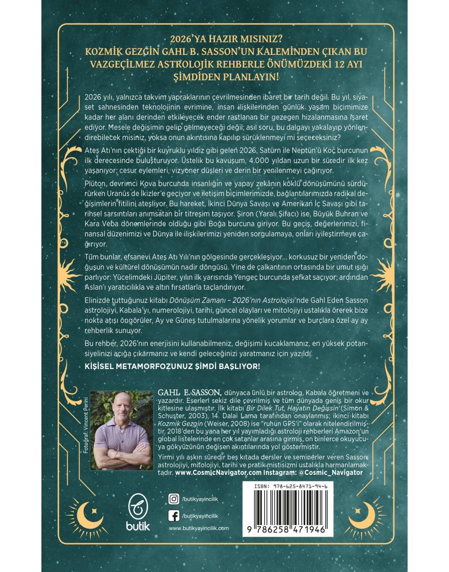 Elinizde tuttuğunuz kitabı Dönüşüm Zamanı – 2026’nın Astrolojisi’nde Gahl Eden Sasson astrolojiyi, Kabala’yı, numerolojiyi, tarihi, güncel olayları ve mitolojiyi ustalıkla örerek bize nokta atışı öngörüler, Ay ve Güneş tutulmalarına yönelik yorumlar ve burçlara özel ay ay rehberlik sunuyor.
