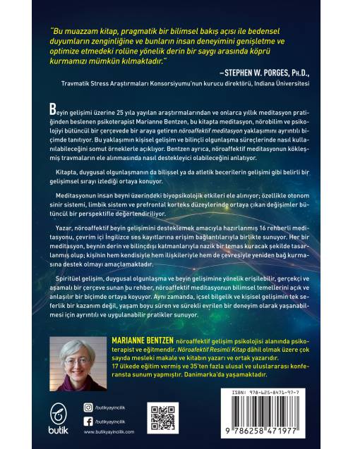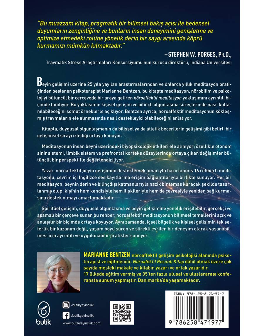 Beyin gelişimi üzerine 25 yıla yayılan araştırmalarından ve onlarca yıllık meditasyon pratiğinden beslenen psikoterapist Marianne Bentzen, bu kitapta meditasyon, nörobilim ve psikolojiyi bütüncül bir çerçevede bir araya getiren nöroafektif meditasyon yaklaşımını ayrıntılı biçimde tanıtıyor. Bu yaklaşımın kişisel gelişim ve bilinçli olgunlaşma süreçlerinde nasıl kullanılabileceğini somut örneklerle açıklıyor. Bentzen ayrıca, nöroafektif meditasyonun kökleşmiş travmaların ele alınmasında nasıl destekleyici olabileceğini anlatıyor.